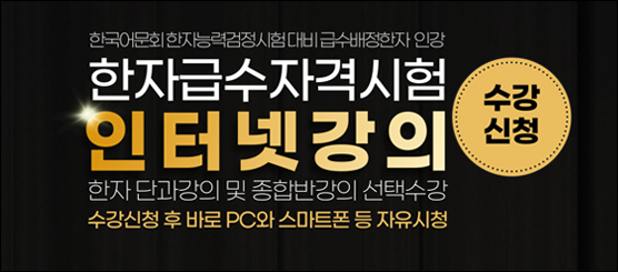 급수배정한자 인터넷강의 수강신청은? 한국어문회/대한검정회/한자교육진흥회/상공회의소 한자급수시험 대비 인터넷강의 단과반강좌와 종합반강좌 중에서 수강하실 강좌를 선택하고 수강(주문)하면 바로 스마트폰과 컴퓨터에서 강의시청 하게 됩니다. 한자공부를 더 재밌고 즐겁게 할 수 있으며, 한자공부 내용이 머리에 쏙쏙 들어오게 됩니다.